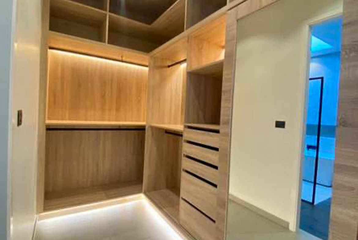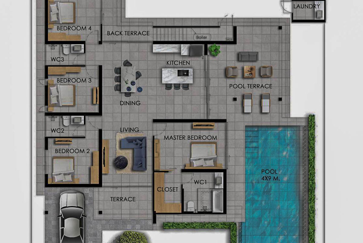 La villa propose une configuration moderne avec de larges espaces de vie ouverts et une circulation fluide entre l’intérieur et les espaces extérieurs.
