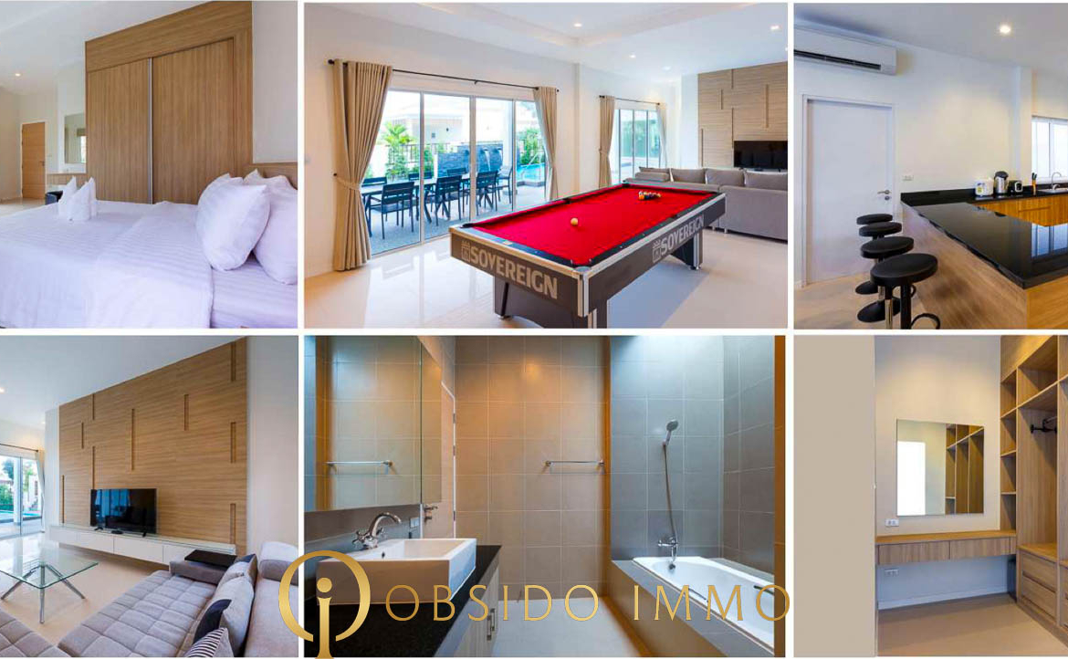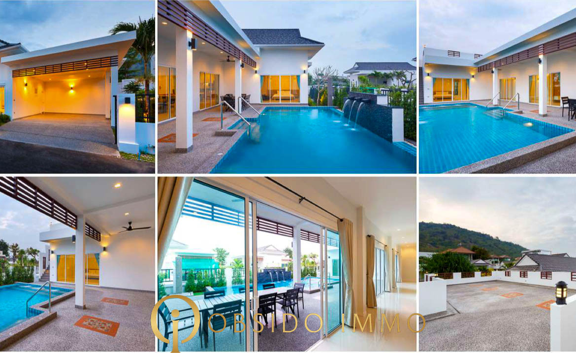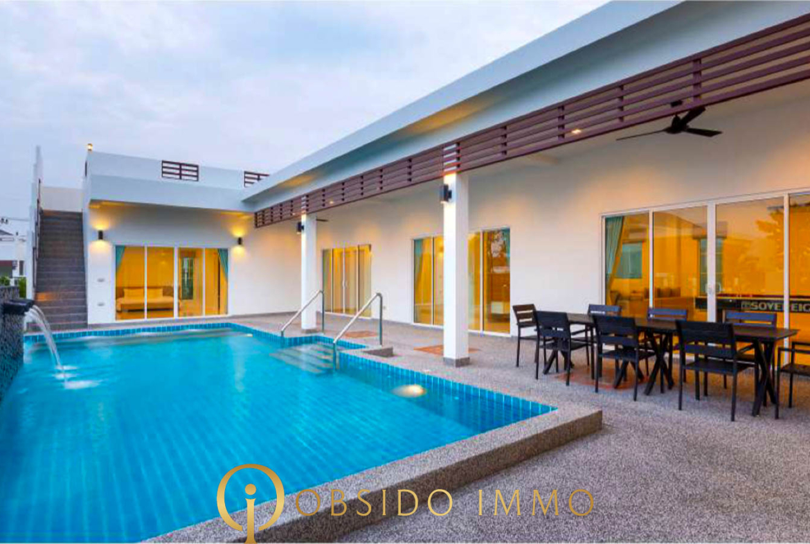 Avec plus de 570 m² de terrain, une piscine privée, 4 chambres / 5 salles de bain et une surface totale construite de plus de 429 m², cette propriété se positionne comme une villa familiale haut de gamme idéale en résidence principale ou en maison secondaire à Hua Hin.