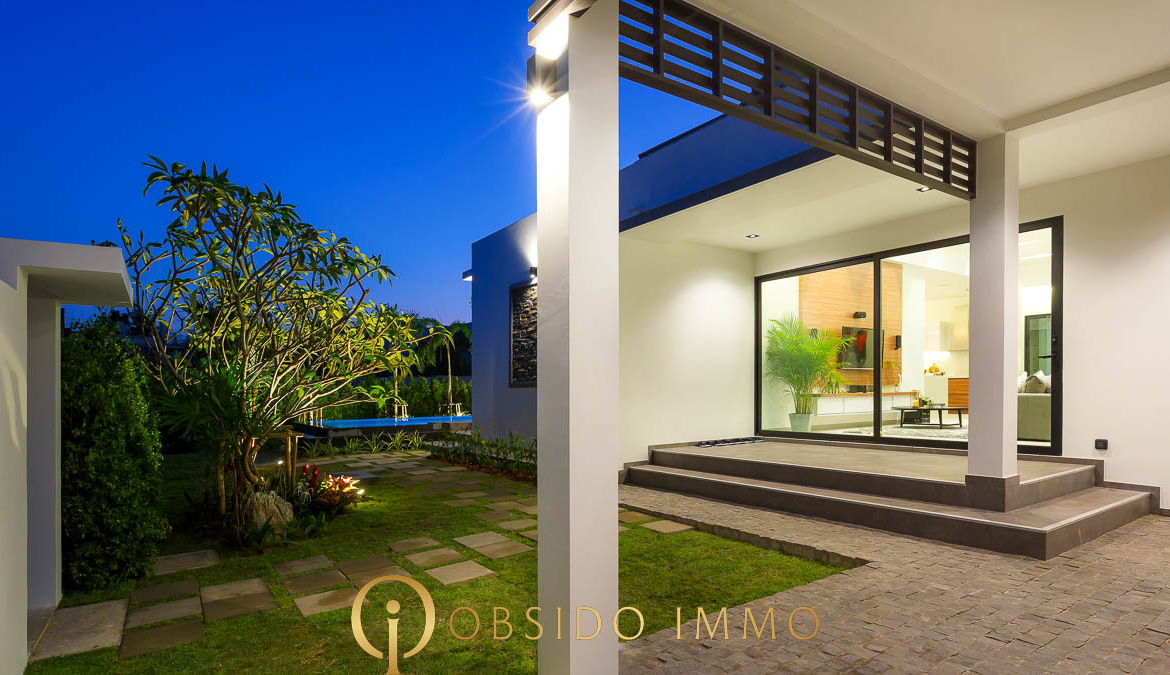 Le projet propose un nombre limité de villas, avec des parcelles généreuses et une conception orientée vers la vie intérieure/extérieure, caractéristique du style de vie à Hua Hin.