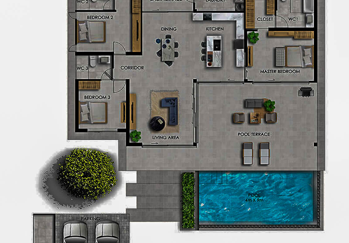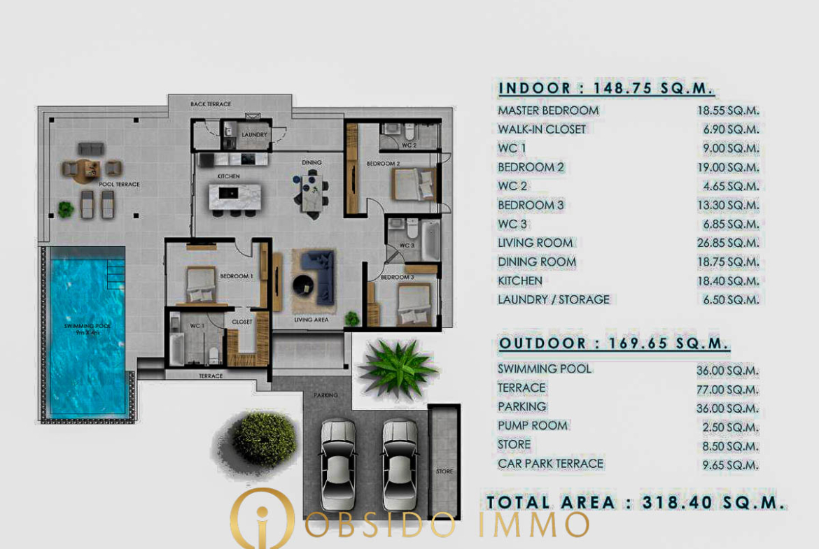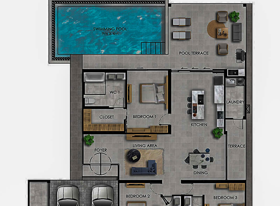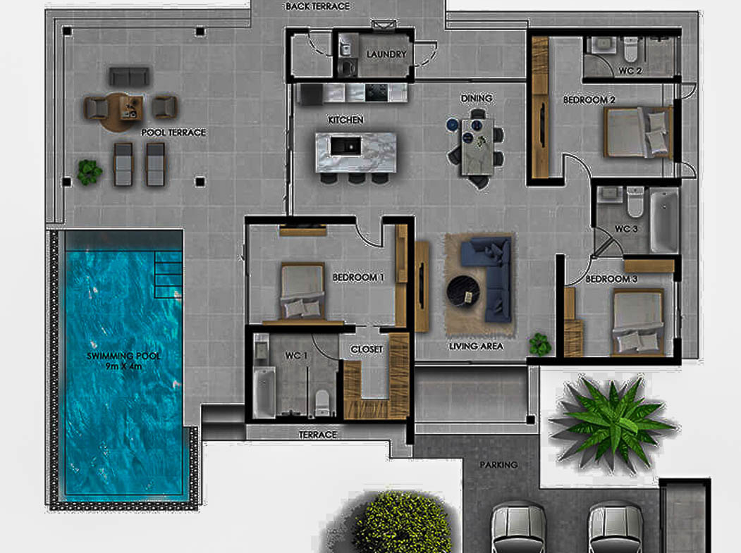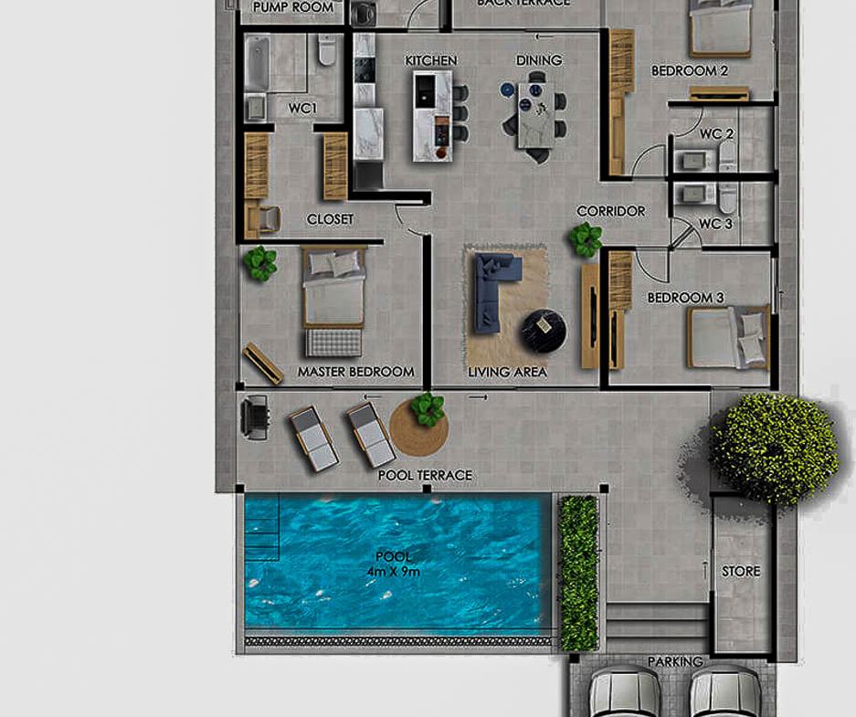 Le projet comprend 56 villas privées réparties en trois modèles (Type A, B et C), sur des parcelles allant d’environ 467 m² à 750 m². Chaque villa est livrée entièrement meublée et équipée, dans une configuration prête à vivre ou à exploiter immédiatement.