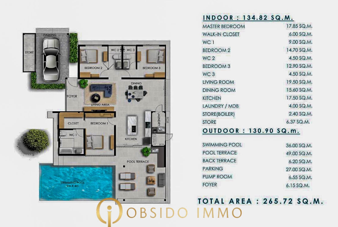 | Mobilier | Villa entièrement meublée (configuration show villa) |