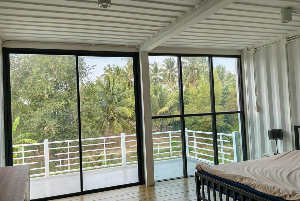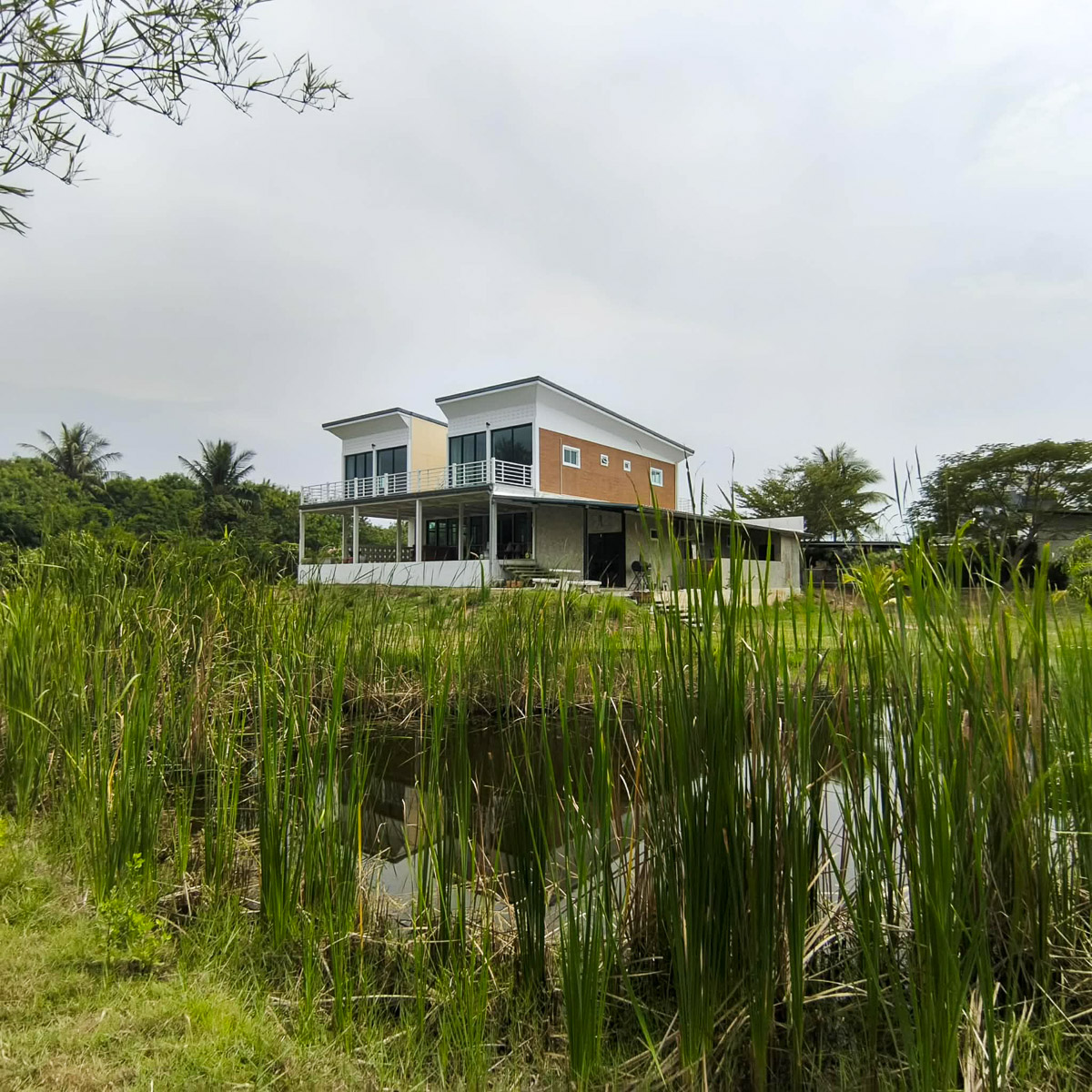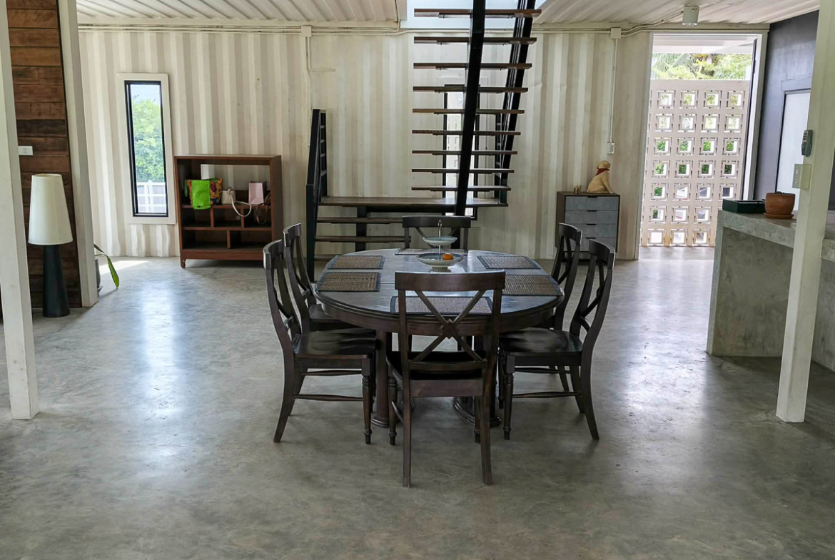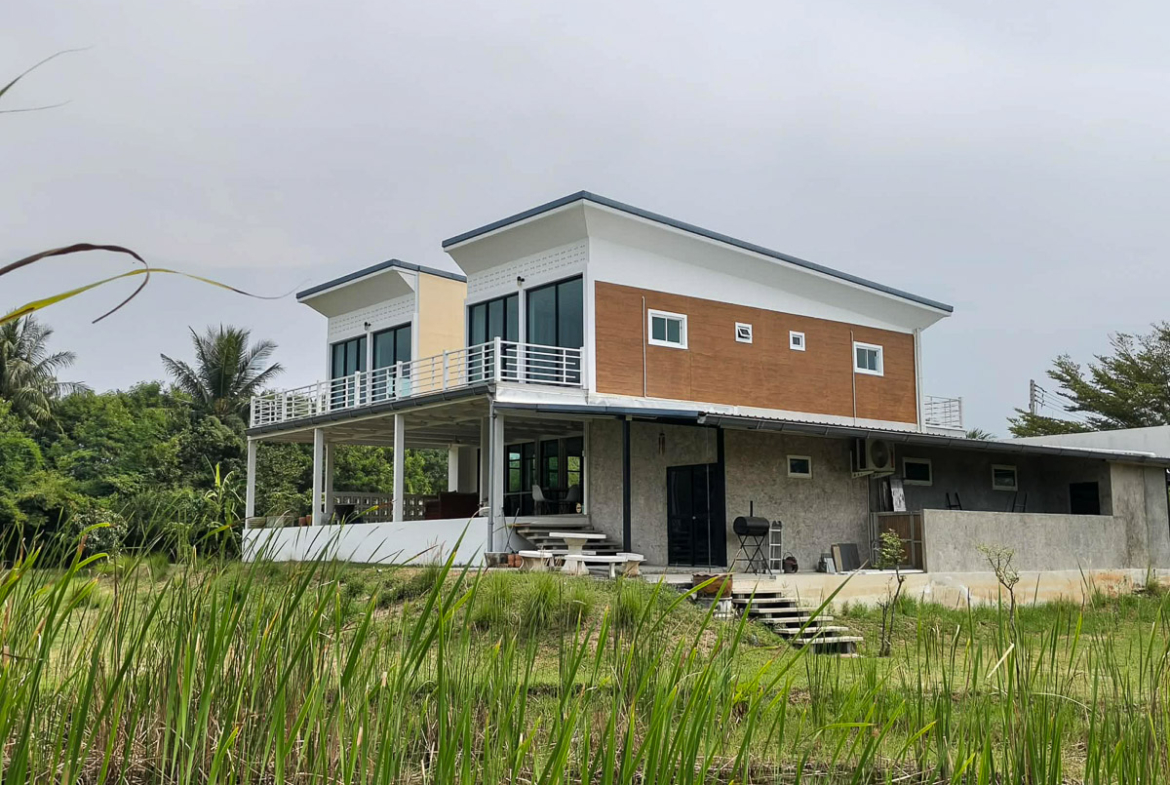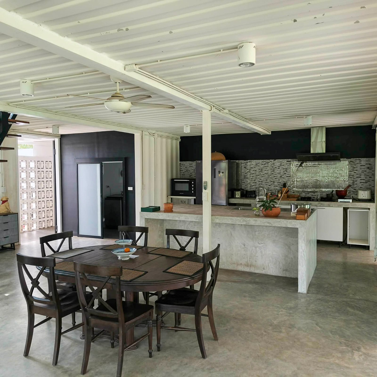 Située dans la campagne paisible de Pranburi, au sud de Hua Hin, cette villa construite à partir de conteneurs revisités propose un concept architectural unique mêlant style loft industriel et environnement tropical.